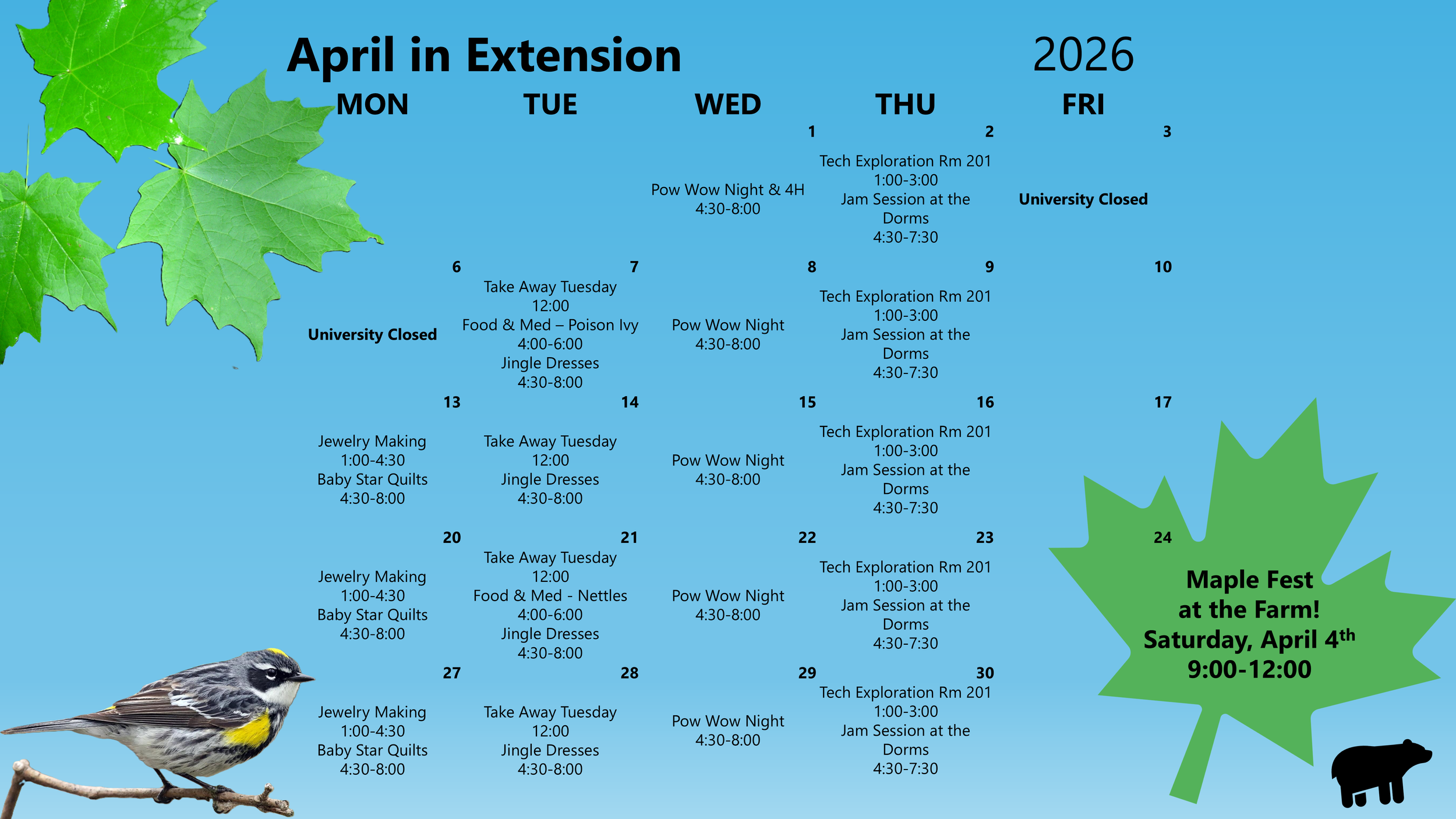 The Extension Department is here for the students and the community. We host many events throughout the year, so come and join us for instructor-led arts & crafts, moccasin making, ribbon shirts & skirts, farm activities, and so much more! Food is always provided when attending an Extension event, so be sure to check out our offerings and register today.